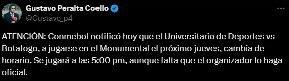 "ATENCIÓN: Conmebol notificó hoy que el Universitario de Deportes vs Botafogo, a jugarse en el Monumental el próximo jueves, cambia de horario. Se jugará a las 5:00 pm, aunque falta que el organizador lo haga oficial", fue lo que dio a conocer el periodista Gustavo Peralta, con lo cual el más beneficiado termina siendo el cuadro de Botafogo.