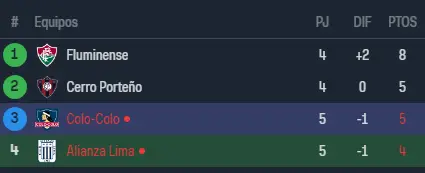 Fluminense se mantiene en el primer lugar con 8 puntos, todavía deben un juego contra Cerro Porteño que tiene 5 puntos, de ahí Colo Colo con 5 también y Alianza Lima último con 4, complicado el panorama de los de Alejandro Restrepo en el final de la fase de grupos de la Copa Libertadores.