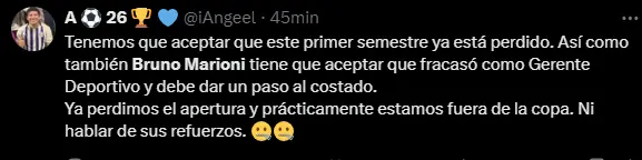 Sobre todo con Jeriel De Santis, quien se ha convertido en el delantero meme del fútbol peruano, todo por sus terribles remates, los cuales siempre se termina yendo afuera, pues ni dirección al arco tiene, lo cual es bastante preocupante, aparte de ello, no tener muchos jugadores para el recambio, esto también es una de las grandes quejas de los hinchas de Alianza Lima para con Bruno Marioni.