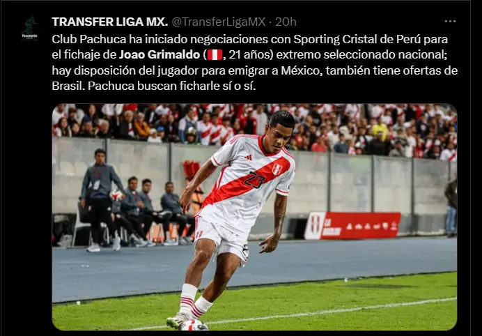 "Club Pachuca ha iniciado negociaciones con Sporting Cristal de Perú para el fichaje de Joao Grimaldo (21 años) extremo seleccionado nacional; hay disposición del jugador para emigrar a México, también tiene ofertas de Brasil. Pachuca buscan ficharle sí o sí"; fue la reciente información compartida por el reconocido portal internacional 'Transfer Liga MX´en relación al nuevo destino que podría esperarle a un Joao Grimaldo que en reiteradas ocasiones ha evidenciado que tiene muchas ganas de emigrar.