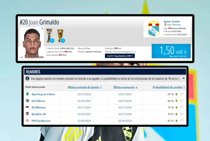 De acuerdo a una información del portal especializado ‘Transfermarkt’ hemos podido conocer que clubes muy importantes del viejo continente están siguiendo muy cerca la posibilidad de fichar a Joao Grimaldo, tales como: PSV Eindhoven, Sporting de Lisboa, AZ Alkmaar y Besiktas. Es así que la joya rimense podrá pegar un tremendo salto a un fútbol muy competitivo, mientras que en la interna de Sporting Cristal deberían ponerse moscas para que el actual plantel no se les desarme.