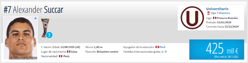 El delantero nacional de 28 años tiene una cotización internacional de 425 mil euros, lo que en soles daría un aproximado arriba de los 1,6 millones, de acuerdo al portal especializado ´Transfermarkt´. Con la noticia de que se quedará en Universitario de Deportes, Alexander Succar deberá volver a pelear por un puesto en la ofensiva ante la salida de algunos compañeros en dicha posición y teniendo la confianza de Jorge Fossati quizá sea una importante ventaja para ello.