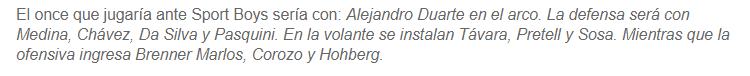 Estamos hablando de Brenner Marlos. De acuerdo a una información del diario local ´Líbero´, el delantero brasileño volverá a las canchas en el partido frente a los chalacos e incluso ya se lo anuncia como titular al lado de Washington Corozo y Alejandro Hohberg, quienes comandarán la ofensiva y deberán ser los encargados de generar las mayores oportunidades de gol.