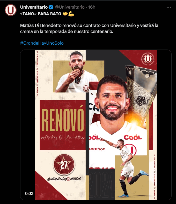 “´Tano´ para rato. Matías Di Benedetto renovó su contrato con Universitario y vestirá la crema en la temporada de nuestro centenario”; fue la publicación con la que los cremas anunciaron la renovación del defensor central titular del campeonato nacional. Es así que Marco Saravia deberá ganarse un lugar de mucho más protagonismo en el 11, teniendo en cuenta además que con la llegada de un nuevo comando técnico como es casi inminente las posibilidades para todos los jugadores se reanudan y veremos si es que este escenario lo favorece o no.