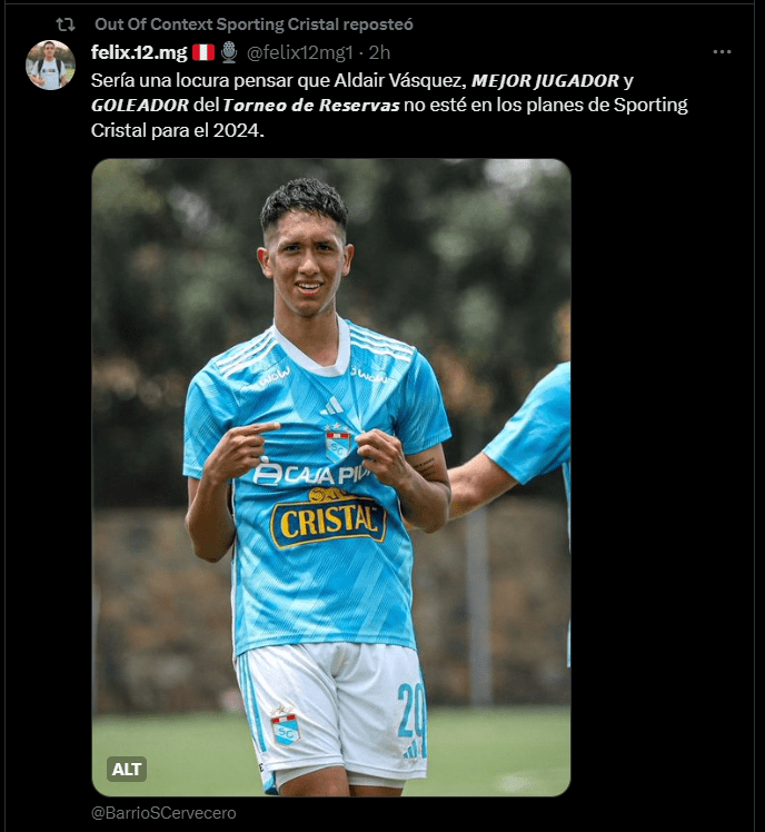 “Sería una locura pensar que Aldair Vásquez, mejor jugador y goleador del Torneo de Reservas, no esté en los planes de Sporting Cristal para el 2024”; fue el contundente comentario del reconocido portal ´Out Of Context Sporting Cristal´ casi que pidiendo que el atacante tiene los méritos suficientes para ser opción en ofensiva en el equipo de Enderson Moreira, quien por cierto es reconocido por apostar en los jóvenes y guiarlos de la mejor manera en su crecimiento.
