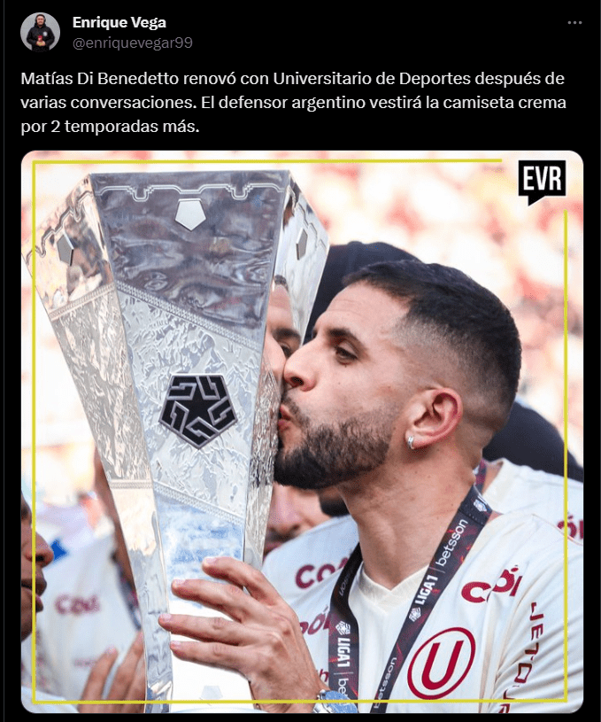 “Matías Di Benedetto renovó con Universitario de Deportes después de varias conversaciones. El defensor argentino vestirá la camiseta crema por 2 temporadas más”; fue la reveladora información del comunicador deportivo Enrique Vega, la cual por cierto viene siendo tendencia en los distintos medios locales y redes sociales por lo que representa el hecho de que la ´U´ podrá contar con la misma línea de 3 en el fondo, esa que tantas alegrías y seguridad generó en el 2023 para conseguir el objetivo de levantar el trofeo nacional.