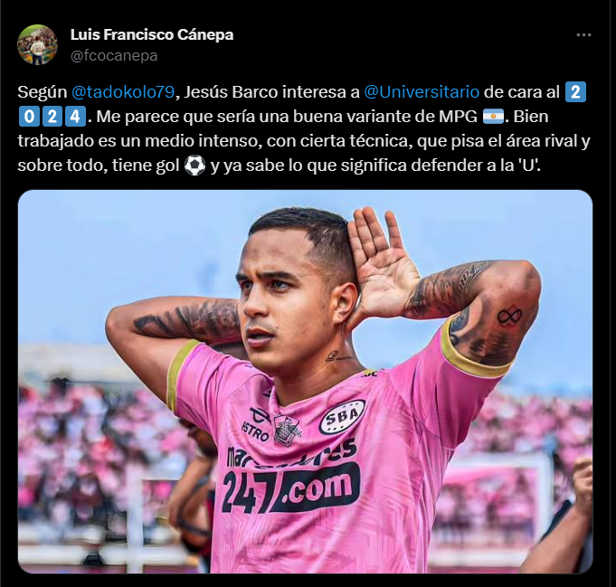 “Según @tadokolo79, Jesús Barco interesa a Universitario de Deportes de cara al 2024. Me parece que sería una buena variante de Martín Perez Guedes. Bien trabajado es un medio intenso, con cierta técnica, que pisa el área rival y sobre todo, tiene gol y ya sabe lo que significa defender a la 'U'”; es la más reciente información del comunicador deportivo Luis Francisco Cánepa en referencia a que desde la directiva merengue podrían tener al volante como importante opción de recambio de cara a la siguiente temporada.