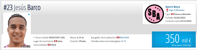 El volante nacional de 26 años tiene una cotización internacional de 350 mil euros, lo que en soles daría un promedio arriba de los 1,3 millones, según el portal especializado ´Transfermarkt´. Es importante mencionar que Jesús Barco tiene contrato con Sport Boys del Callao hasta finales de la temporada 2024, por lo que en los siguientes días podría darse una novedad al respecto si es que verdaderamente Universitario de Deportes quiere hacerse de sus servicios.