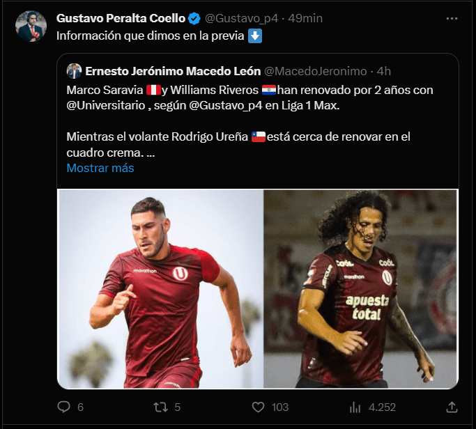 “Marco Saravia y Williams Riveros han renovado por 2 años con Universitario de Deportes, según Gustavo Peralta en Liga 1 Max. Mientras el volante Rodrigo Ureña está cerca de renovar en el cuadro crema. Universitario asegura la zona defensiva de cara a su centenario”; fue la información compartida por el comunicador deportivo en mención que seguramente tiene muy contentos a los hinchas de la ´U´ que, además de andar peleando hasta último momento esta temporada 2023, ya vienen pensando y planificando lo que será el siguiente año.