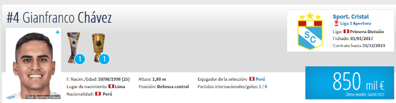 El defensor central de Sporting Cristal tiene una cotización internacional en el mercado monetario de 850 mil euros, lo que en soles sería un promedio arriba de los 3 millones 100 mil, según el portal especializado ´Transfermarkt´. Desde hace un par de temporadas viene cumpliendo muy buenas labores en el torneo local y en las competiciones internacionales, por lo que una oportunidad de emigrar al viejo continente le caería perfecto en sus aspiraciones de incluso poder ser visto por el comando técnico de la Selección Peruana.