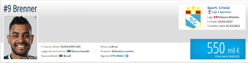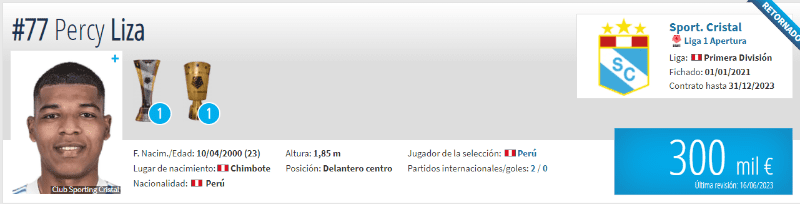 Brenner Marlos tiene una cotización internacional de 550 mil euros y Percy Liza tiene un precio monetario de 300 mil euros, lo que en soles daría un aproximado arriba de los 3,2 millones, de acuerdo al portal especializado ´Transfermarkt´. Sin duda alguna será un alivio para la directiva celeste el hecho de prescindir de dos jugadores que no dieron la talla en este 2023 y que en lugar de ellos llegará alguien con mayor presencia y que le daría al plantel un importante salto de calidad como lo es Kevin Serna.