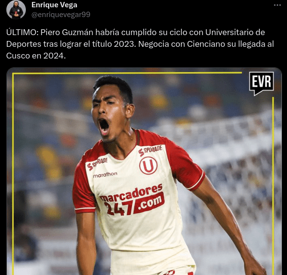 Ahora, no sería el único que se va de Universitario de Deportes, ya que también se sabe de la salida de Piero Guzmán, quien está temporada estuvo más en el banco que otra cosa, pero que se sabe que ya no continuaría en el club, así que ya está con las maletas listas y hasta ofertas se le ha llegado a conocer. “ÚLTIMO: Piero Guzmán habría cumplido su ciclo con Universitario de Deportes tras lograr el título 2023. Negocia con Cienciano su llegada al Cusco en 2024”, se pudo conocer por medio de Enrique Vega.