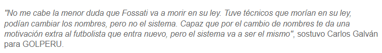 “No me cabe la menor duda que Fossati va a morir en su ley. Tuve técnicos que morían en su ley, podían cambiar los nombres, pero no el sistema. Capaz por el cambio nombres le da una motivación extra al futbolista que entra nuevo, pero el sistema va a ser el mismo”; comentó el exzaguero crema en una reciente entrevista con ´GolPerú´.