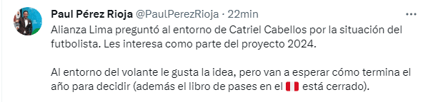 La realidad es que se ha conocido que Alianza Lima lo ve como un jugador que podría llegar a aportar al proyecto que tienen en mente para el próximo año, es por ello que ya han preguntado por sus servicios, lo cual en el entorno del jugador les parece más que interesante, sobre todo teniendo en cuenta que es un futbolista que todavía minutos, así que si un grande se los puede dar, lo beneficiarían bastante.