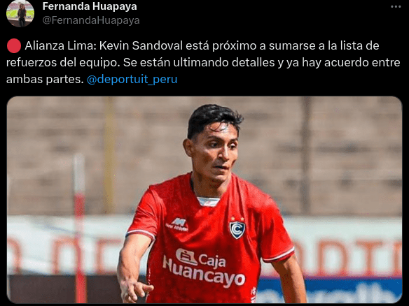“Alianza Lima: Kevin Sandoval está próximo a sumarse a la lista de refuerzos del equipo. Se están ultimando detalles y ya hay acuerdo entre ambas partes", se pudo conocer por la periodista Fernanda Huapaya en sus redes sociales, con lo cual Alianza Lima sigue poco a poco armando un equipo competitivo el cual pudiera pelear por lograr el título de la Liga 1, que es el primer objetivo del conjunto ‘blanquiazul’.