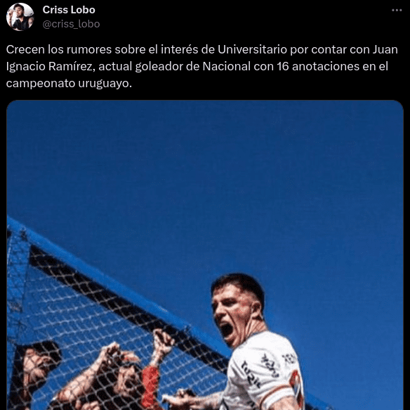 Ahora, todo hace indicar que llegaría un 9 de Uruguay, así se pudo conocer. “Crecen los rumores sobre el interés de Universitario por contar con Juan Ignacio Ramírez, actual goleador de Nacional con 16 anotaciones en el campeonato uruguayo”. De esta forma, Universitario de Deportes podría ganar un atacante fuerte, que tenga olfato goleador y que sobre todo, no tenga miedo a anotar goles que parce tienen los actuales atacantes.