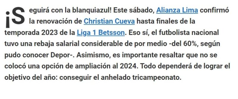 Christian Cueva para rato. Alianza Lima renovó contrato con Christian Cueva por todo el 2023. “Cueva es blanquiazul. Cueva se queda en casa. ¡A lograr el tricampeonato! ¡Todos juntos!”, señaló el cuadro de La Victoria en su cuenta oficial de Twitter. Asimismo, el cuadro de La Victoria compartió una imagen del futbolista con la palabra “Renovación”.