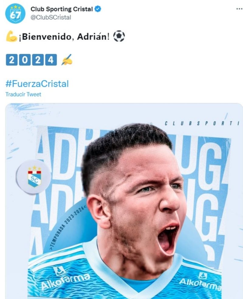 “¡Bienvenido Adrián!”, fueron las palabras que publicó el club cervecero para con su flamante refuerzo a través de su cuenta de Twitter. El delantero de 25 años fue convocado recientemente a la Selección Peruana que dirige Juan Reynoso, además pasó por equipos como Universidad San Martín, UTC, Real Garcilaso (ahora Cusco FC), York United, así como Universitario y Alianza Lima.