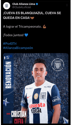 Resulta que a través de las redes sociales oficiales del club blanquiazul han revelado la continuidad del volante nacional. Es decir, ya no tendrá que regresar al Al-Fateh de Arabia Saudita al haberse concretado un nuevo acuerdo de préstamo. “¡Cueva es Blanquiazul, Cueva se queda en casa! A lograr el Tricampeonato. ¡Todos juntos!”; fue la publicación vía redes sociales.