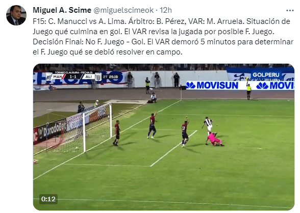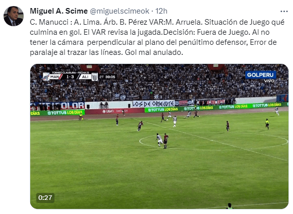 Luego vendría el robo a Alianza Lima, en el tercer tanto que sería de Aldair Rodríguez. “C. Manucci : A. Lima. Árb. B. Pérez VAR:M. Arruela. Situación de Juego qué culmina en gol. El VAR revisa la jugada.Decisión: Fuera de Juego. Al no tener la cámara perpendicular al plano del penúltimo defensor, Error de paralaje al trazar las líneas. Gol mal anulado”.
