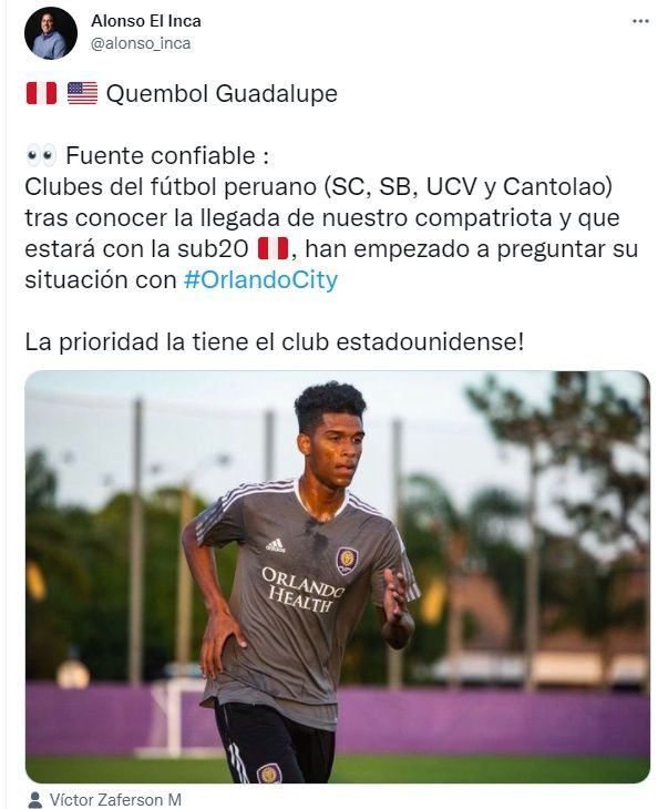 "Clubes del fútbol peruano (SC, SB, UCV y Cantolao) tras conocer la llegada de nuestro compatriota y que estará con la sub20, han empezado a preguntar su situación con Orlando City", publicó el periodista Alonso El Inca en Twitter.