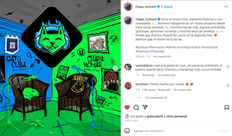 "En las buenas y más aún en las malas, apoyándonos en todo, con los años encontramos la forma de entendernos. El viaje de la vida misma y su infinidad de anécdotas y risas. Tan hermanos, tan distintos. Buena onda, las ganas de reír y hablar. Sinceridad entre patas. Al final siempre es eso: #hablabateria #podcast" , escribió Cuba en su cuenta de Instagram.