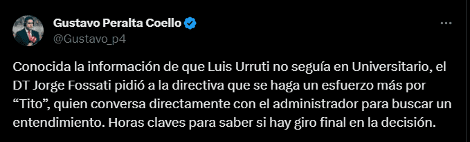 “Conocida la información de que Luis Urruti no seguía en Universitario, el DT Jorge Fossati pidió a la directiva que se haga un esfuerzo más por ´Tito´, quien conversa directamente con el administrador para buscar un entendimiento. Horas claves para saber si hay giro final en la decisión”; fue la más reciente y reveladora información con la que el comunicador deportivo Gustavo Peralta dejó muy en claro que podrían darse cambios en la primera decisión de ya no contar con los servicios del atacante uruguayo, quien recordamos juega peruano la Liga 1.