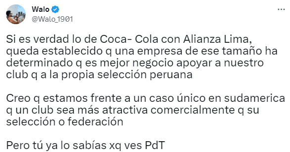 Pero no se trata de un jugador de fútbol, sino más bien de una empresa, pues se ha conocido que Coca Cola está detrás de Alianza Lima, la empresa norteamericana ve con muy buenos ojos lo que se está haciendo con el club, tanto en el marketing como los títulos que está consiguiendo, por ese motivo es que quieren formar parte de la institución y se viene negociando esto bajo 7 llaves.