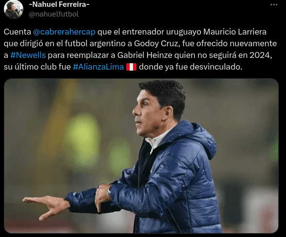 Pero a pesar de su salida de Alianza Lima, ahora está cerca de un nuevo equipo en Argentina. “Cuenta @cabrerahercap que el entrenador uruguayo Mauricio Larriera que dirigió en el futbol argentino a Godoy Cruz, fue ofrecido nuevamente a #Newells para reemplazar a Gabriel Heinze quien no seguirá en 2024, su último club fue #AlianzaLima donde ya fue desvinculado”, se conoció mediante el comunicador, Nahuel Ferreira.