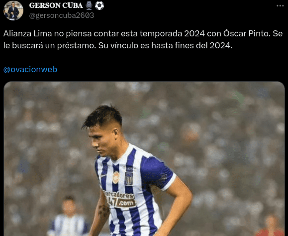 “Alianza Lima no piensa contar esta temporada 2024 con Óscar Pinto. Se le buscará un préstamo. Su vínculo es hasta fines del 2024”, se pudo conocer por Gerson Cuba, con lo cual ya queda más que claro que no lo quieren en Alianza Lima, así que con ello su salida es inminente en el club, se pensó que podría llegar a ser un crack exportable, pero fallaron, 450 mil pagaron por él según transfermarkt, pero no pudieron recuperar nada de esta inversión.