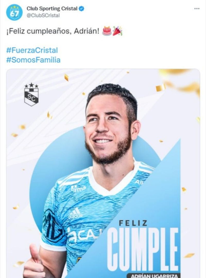 Esto debido a que el club posteó y saludó a Adrián Ugarriza por su onomástico. "¡Feliz cumpleaños, Adrián!", fue lo que posteó Sporting Cristal junto a la foto del '9' luciendo ya la camiseta celeste. La apuesta del club rimense por el jugador es clara. Por ende, el contrato de Ugarriza con Cristal va hasta diciembre del 2024. Con un total de 10 goles y un total de 28 partidos en Cienciano la temporada anterior (26 de titular), es que Adrián buscará ser el centro delantero en la oncena de Tiago Nunes. A pesar de las condiciones que tiene Ugarriza, diversos hinchas reclamaron por la publicidad que el club le estaría haciendo a un jugador que no es crack, como por ejemplo Yoshimar Yotún.