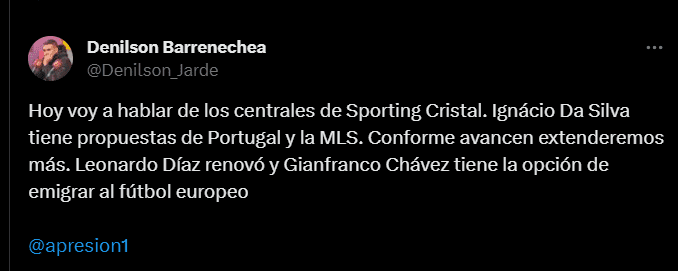 “Hoy voy a hablar de los centrales de Sporting Cristal. Ignácio Da Silva tiene propuestas de Portugal y la MLS. Conforme avancen extenderemos más. Leonardo Díaz renovó y Gianfranco Chávez tiene la opción de emigrar al fútbol europeo”; fue el dato con el que el comunicador en mención reveló posibles cambios en Sporting Cristal, lo cual deja en evidencia que el proyecto celeste no está teniendo los resultados que se esperados y por más que se enfoquen en las divisiones menores, hoy ha quedado claro que no es suficiente para lograr títulos nacionales.