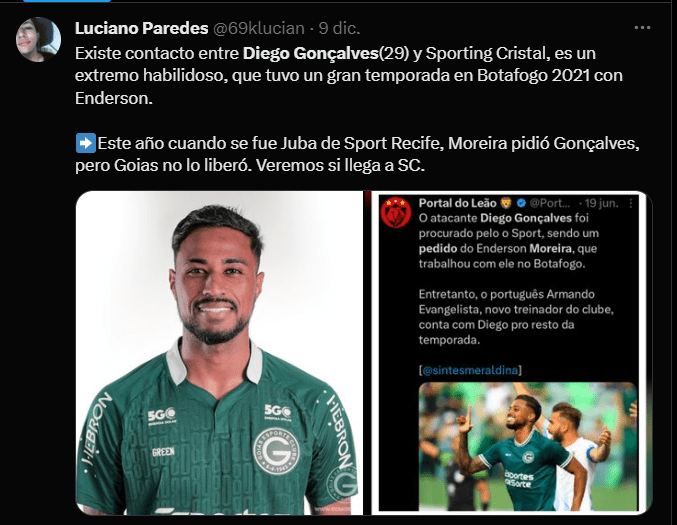 “Existe contacto entre Diego Gonçalves (29) y Sporting Cristal. Es un extremo habilidoso, que tuvo una gran temporada en Botafogo 2021 con Enderson. Este año cuando se fue Juba de Sport Recife, Moreira pidió a Gonçalves, pero Goiás no lo liberó. Veremos si llega a SC”; fue la más reciente y reveladora información con la que el comunicador nacional Luciano Paredes dio a conocer el interés que existe por parte de la directiva hacia un jugador que tranquilamente podría marcar la diferencia en la Liga 1 y dejar en el olvido de una vez por todas a un Washington Corozo que es muy resistido por la hinchada.