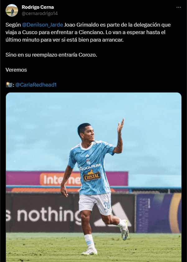 “Joao Grimaldo es parte de la delegación que viaja a Cusco para enfrentar a Cienciano. Lo van a esperar hasta el último minuto para ver si está bien para arrancar. Sino en su reemplazo entraría Corozo. Veremos”; fue la información con la que el periodista deportiva Rodrigo Cerna dio a conocer la posición del DT brasileño respecto a la presencia o no del extremo rimense que viene de competir de muy buena manera en la Selección Peruana y que por obvios motivos es un verdadero plus tenerlo desde el inicio en un partido de tanto importancia como el que se jugará en algunas horas más.