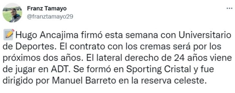 "Hugo Ancajima firmó esta semana con Universitario de Deportes. El contrato con los cremas será por los próximos dos años. El lateral derecho de 24 años viene de jugar en ADT. Se formó en Sporting Cristal y fue dirigido por Manuel Barreto en la reserva celeste", reveló el periodista Franz Tamayo en Twitter.