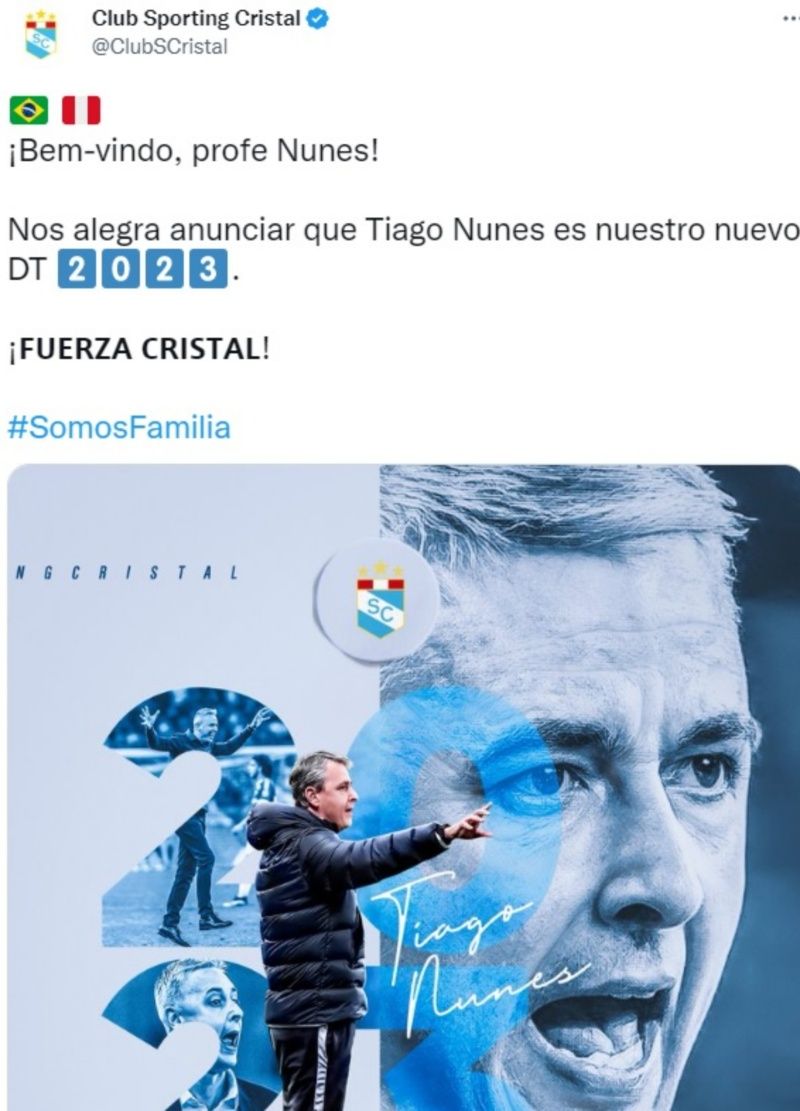 “¡Bem-vindo, profe Nunes! Nos alegra anunciar que Tiago Nunes es nuestro nuevo DT. Fuerza Cristal”, fue el mensaje de bienvenida que la escuadra del Rímac compartió, en sus redes sociales, confirmando la llegada del estratega que se hará cargo del primer equipo en los próximos días para iniciar la pretemporada. Con la llegada de Tiago Nunes, Sporting Cristal sumará su séptimo estratega brasileño en su historia. El ex DT de Ceará se sumará a la lista entregada por Paulo Autuori (el más recordado por los bajopontinos), Didí, Yardo Barbalho, Juan Carlos Amaral, José Luis Carbone y René Weber.