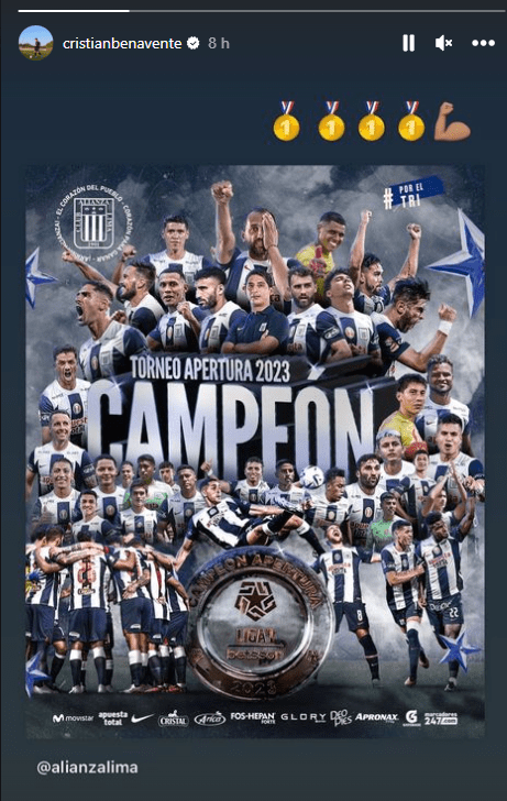 Cristian Benavente no dudó un solo minuto en celebrar el título que consiguió Alianza Lima, al lograr alzarse con el Torneo Apertura, una gran noticia para él, que ahora tendrá la chance de poder seguir luchando por ser campeón nacional. Es por ello que en su historia no tuvo otra reacción que publicar la foto que publicó el club en sus redes sociales y agregar algunas medallas de primer lugar como emojis.