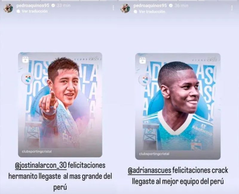 "Jostin, felcitaciones hermanito. Llegaste al más grande del Perú", escribió Aquino a Alarcón. Mientras que a Adrián Ascues lo siguiente: "Felicitaciones crack, llegaste al mejor equipo del Perú". Recordemos que el pivote de la bicolor logró dos títulos nacionales con Sporting Cristal en los años 2014 y 2016.