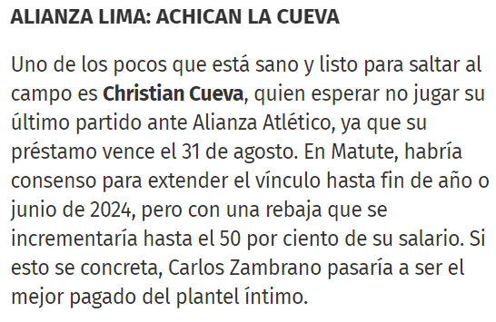 Según se ha conocido mediante el diario Trome, lo que Alianza Lima estaría pensando hacer es bajarle el sueldo a Christian Cueva, solo darle hasta un 50% de su sueldo, con lo cual el otro 50% debería pagarlo el Al Fateh o simplemente olvidarse de él, esto es lo que están viendo, pero todavía el cuadro Árabe no sabe que decisión tomar, pues su contrato con el cuadro ‘íntimo’ vence el 31 de agosto.