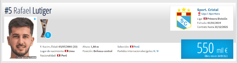 El defensor central formado en las canteras de Sporting Cristal tiene una cotización internacional en el mercado monetario de 550 mil euros, según el portal especializado ´Transfermarkt´. Con 22 años y siendo una importante pieza de recambio en el armado de juego del profesor Tiago Nunes, está claro que su polifuncionalidad en el equipo ha sido muy importante durante la presente temporada al haberlo hecho de zaguero y de lateral cuando fue requerido así por el comando técnico.