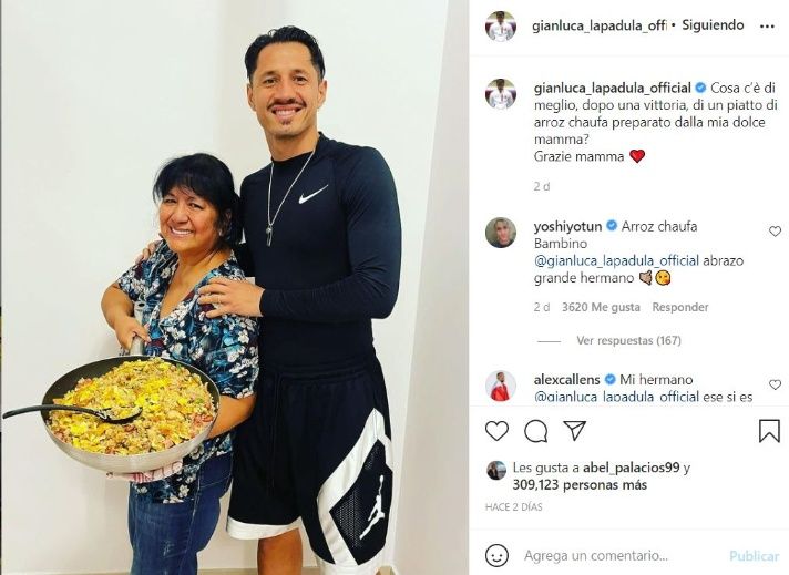 “¿Qué hay mejor, después de una victoria, que un plato de arroz chaufa preparado por mi dulce madre?” Gracias, mamá”, escribió el Bambino en Instagram en italiano. Este mensaje fue acompañado con una postal del atacante junto a su madre con una olla de arroz chaufa.