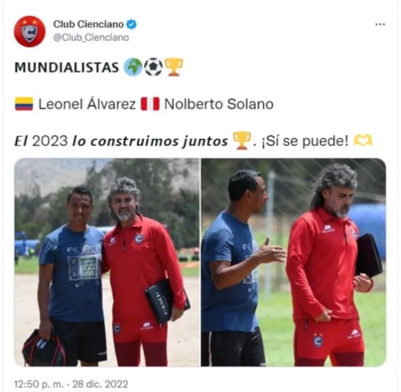 "El 2023 lo construimos juntos. ¡Sí se puede!", es la descripción que realizó el elenco imperial en sus redes sociales. En el post, el cuadro cusqueño sorprendió gratamente a sus miles de hinchas al postear unas fotos del su nuevo entrenador, Leonel Álvarez, junto a Nolberto Solano. Cabe precisar que Cienciano, se viene preparando arduamente tras conocer que enfrentará a Universitario en la Copa Sudamericana. De esta manera, en las últimas horas el club también anunció el fichaje del defensor paraguayo José Ramón Leguizamón.