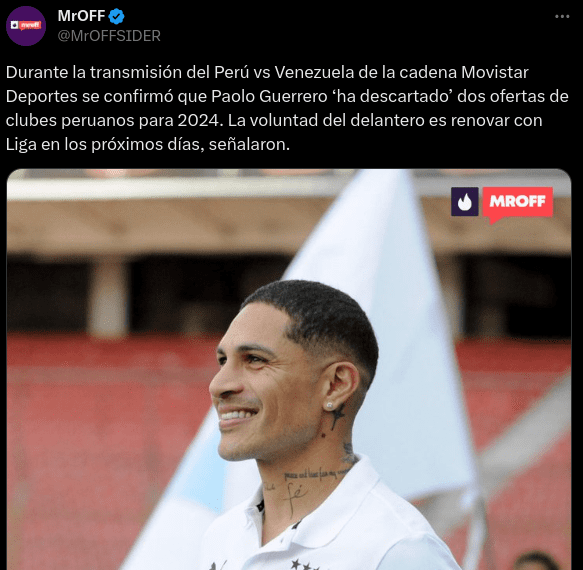 “Durante la transmisión del Perú vs Venezuela de la cadena Movistar Deportes se confirmó que Paolo Guerrero ‘ha descartado’ dos ofertas de clubes peruanos para 2024. La voluntad del delantero es renovar con Liga en los próximos días, señalaron”, se ha podido conocer por MrOFFSIDER, con lo cual al parecer Paolo Guerrero no tiene en su mente llegar a Alianza Lima sino seguir en el extranjero, en donde le está yendo bastante bien, algo que es importante para él y sobre todo, puede ganar títulos.