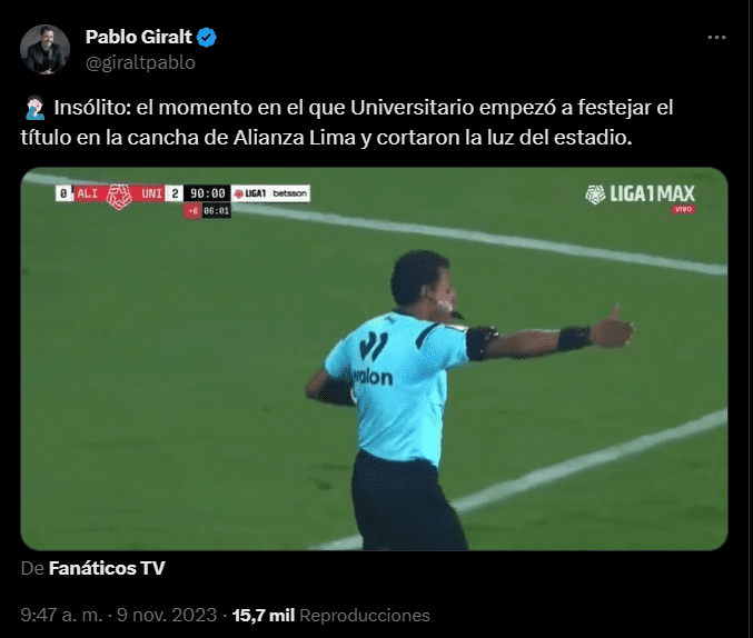 “Insólito: el momento en el que Universitario empezó a festejar el título en la cancha de Alianza Lima y cortaron la luz del estadio”; fue el comentario con el que periodista argentino se hizo presente en su cuenta oficial de twitter generando gran tendencia y mostrando un claro desentendimiento de lo que ha ocurrido el día de ayer en horas de la noche cuando se suponía que iba a darse la premiación de por medio y todo lo que representa un hecho tan importante para un equipo como es ser campeón.