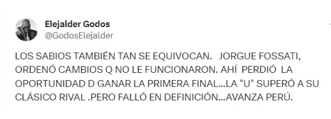 “Los sabios también se equivocan. Jorge Fossati ordenó cambios que no le funcionaron. Ahí perdió la oportunidad de ganar la primera final. La ‘U’ superó a su clásico rival, pero falló en definición. Avanza Perú”; fue el más reciente comentario con el que Elejalder Godos se hizo presente en sus redes sociales oficiales tratando de bajarle los ánimos a quienes cuestionan al DT charrúa por sus movimientos que muchos hinchas esperan que no repita en el partido de vuelta que será de mucha más relevancia por lo que representa el hecho de sumar una nueva estrella.