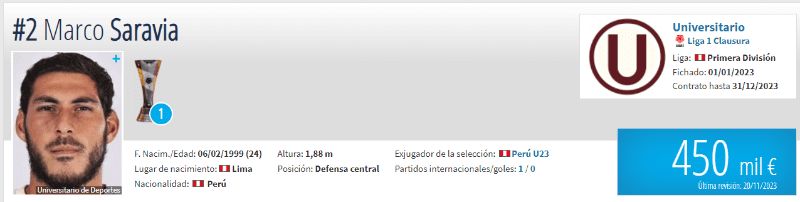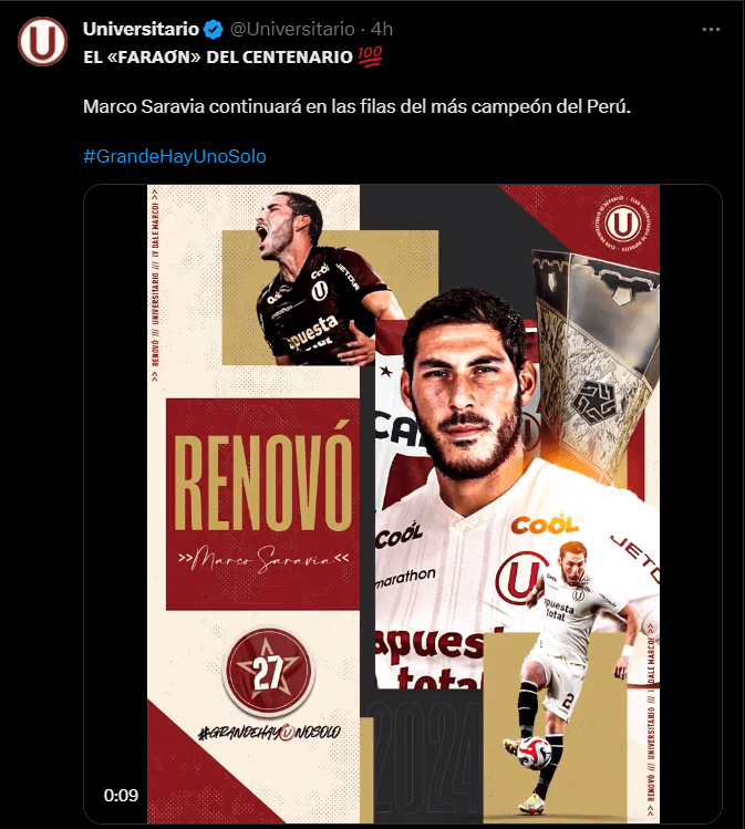 “EL FARAON DEL CENTENARIO. Marco Saravia continuará en las filas del más campeón del Perú.”; fue la más reciente publicación con la que Universitario de Deportes aseguró al defensor central y así empezó a darle más forma a su plantel que en unas semanas empezará la pretemporada pensando en los objetivos del 2024, teniendo en cuenta que además de defender la corona de la Liga 1 deberán competir en el más alto nivel posible la Copa Libertadores de América y por qué no pensar en avanzar de rondas tras la fase de grupos.