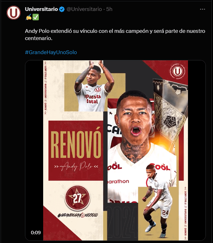 “Andy Polo extendió su vínculo con el más campeón y será parte de nuestro centenario”; fue la publicación vía redes sociales con la que Universitario de Deportes dio a conocer a nivel nacional que el carrilero merengue se mantendrá en el club de sus amores para seguir siendo uno de los máximos referentes de la garra crema y seguir por el camino del éxito en una temporada de tanta relevancia para la institución merengue como lo es la celebración del aniversario número 100 de uno de los clubes más prestigiosos del fútbol peruano.