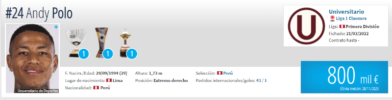 El lateral/volante de Universitario de Deportes y de la Selección Peruana tiene una cotización internacional de 800 mil euros, lo que en soles daría un promedio arriba de los 3 millones, de acuerdo al portal especializado ´Transfermarkt´. De esta manera se confirma que el vestuario merengue seguirá teniendo esa cuota de identificación e hinchaje que fue recontra clave para que en el año 2023 hayan podido sacar adelante un estupendo proceso.