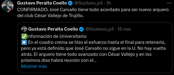 José Carvallo no la pensó 2 veces y decidió salir de Universitario de Deportes, una decisión bastante controversial, sobre todo sabiendo que podía estar en el equipo del Centenario, pero decidió que era momento de dar un paso al costado, es así como terminó diciendo adiós por la puerta grande, ya que lo hizo siendo campeón lo cual lo deja en la memoria de los hinchas, por lo que ahí si llegó a tomar el tiempo ideal para decir adiós.
