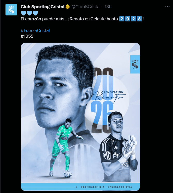 “El corazón puede más… ¡Renato es Celeste hasta 2026! Fuerza Cristal”; fue el mensaje con el que el club bajopontino dio a conocer que Solís, su arquero titular, se quedará en el equipo de cara a las próximas 3 temporadas y así también terminaron de una vez por todas con todos los rumores que lo alejaban de La Florida y que incluso lo acercaban a otro de los grandes del fútbol peruano. Dicho texto en el post se puede entender como un mensaje entre líneas hacia los equipos que pretenden jalarse a las figuras celestes.
